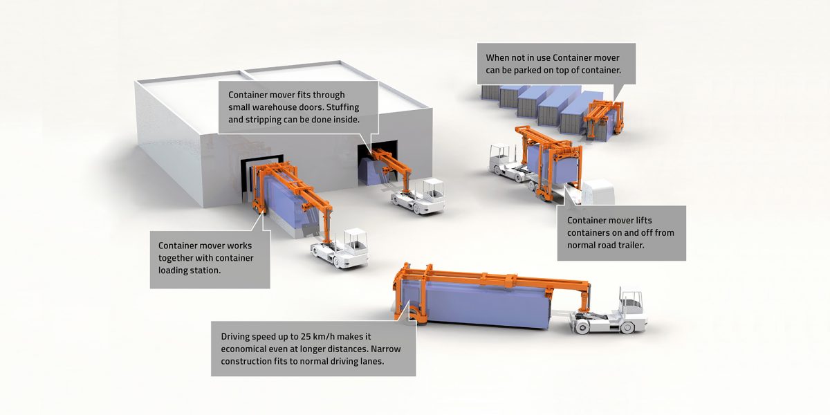 It is especially suitable for applications where containers must be transported through narrow and low doors or when transport distances are longer. Pulled by a terminal tractor, the container mover can pick, transport, and leave containers independently from cranes and other lifting equipment – one machine takes care of all container moves.