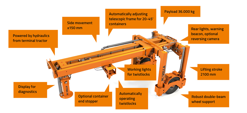 It is especially suitable for applications where containers must be transported through narrow and low doors or when transport distances are longer. Pulled by a terminal tractor, the container mover can pick, transport, and leave containers independently from cranes and other lifting equipment – one machine takes care of all container moves.