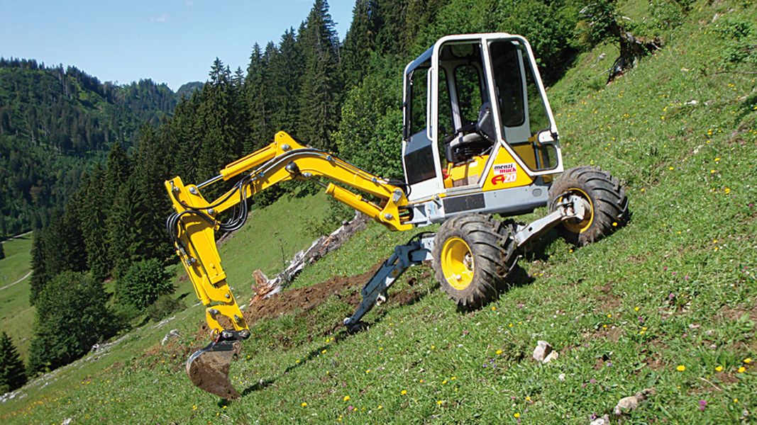 Explore modelsThe walking excavators' special features are based on a sophisticated high-tech chassis and the patented boom: various hydraulic cylinders enable the all-rounder to adapt its wheels and supports to any terrain. For this in some countries the Menzi muck is also called spider excavator.